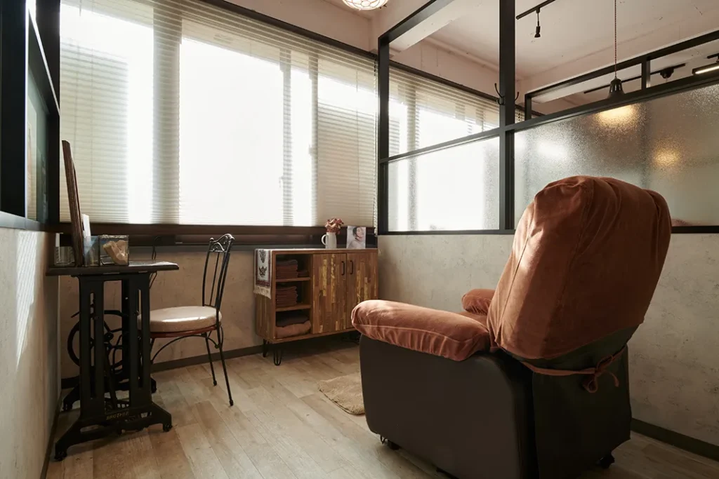 ジャズが流れるカフェのような店内。他のお客さまが気にならないように、施術スペースはゆったりとした広さを確保した半個室に。ふかふかの電動ソファでくつろぎながら施術を受けていただくことができ、施術後にゆっくりメイク直しをしていただける専用の鏡台もご用意。お飲み物やスイーツもお楽しみいただけます。